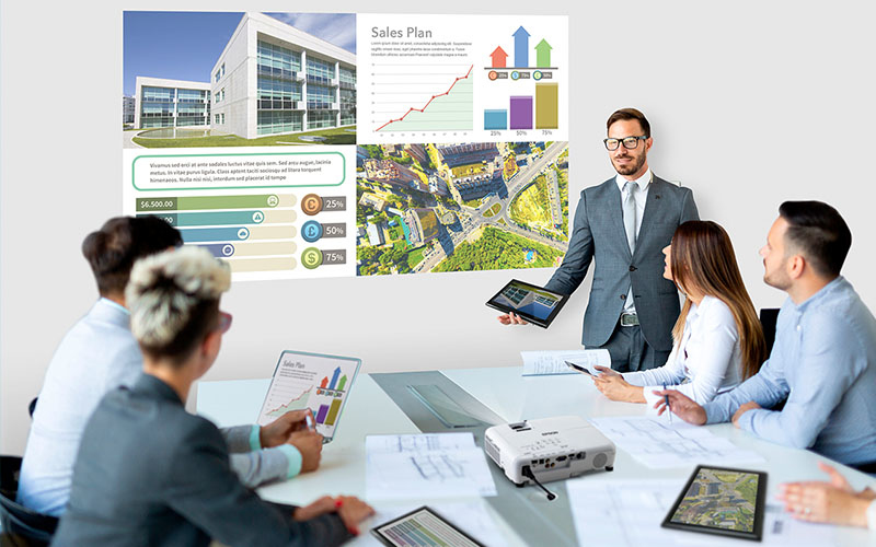Dankzij de ingebouwde draadloze connectiviteit krijgt u eenvoudig en intuïtief toegang tot de projector vanaf een compatibel smart device met de iProjection-app1. Geef content weer met de vrijheid om rond te lopen en interacties aan te gaan met uw publiek. Door de split screen-mogelijkheid kan content van meer dan één apparaat tegelijk worden weergegeven zonder dat twee aparte weergaveapparaten nodig zijn.