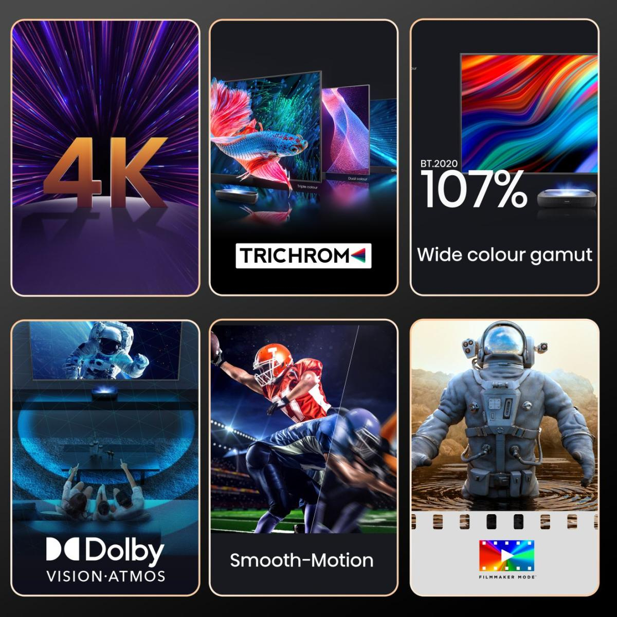 Dompel jezelf onder in 4K-beelden van bioscoopkwaliteit op slechts enkele centimeters afstand met de Hisense 120L9HA ultra short throw projector. Met deze compacte DLP-laserprojector ervaar je films en games met ongelooflijke helderheid en kleuren op epische schaal. Projecteer een verbluffend gedetailleerd 4K UHD-beeld tot een diameter van 120 inch met behulp van het ruimtebesparende ultra short throw-ontwerp. Met 3.000 lumen aan laservermogen en 10-bits kleurdiepte geniet je van rijke, stralende beelden die van het scherm knallen. De laserlichtbron gaat ongelooflijk lang mee, 25.000 uur – 25 jaar voor de meeste gebruikers. Sluit al je apparaten moeiteloos aan met HDMI 2.0/2.1, Wi-Fi 5 en Bluetooth streaming. Breng de grootbeeld bioscoopervaring thuis met ultra short throw 4K projectie van Hisense.