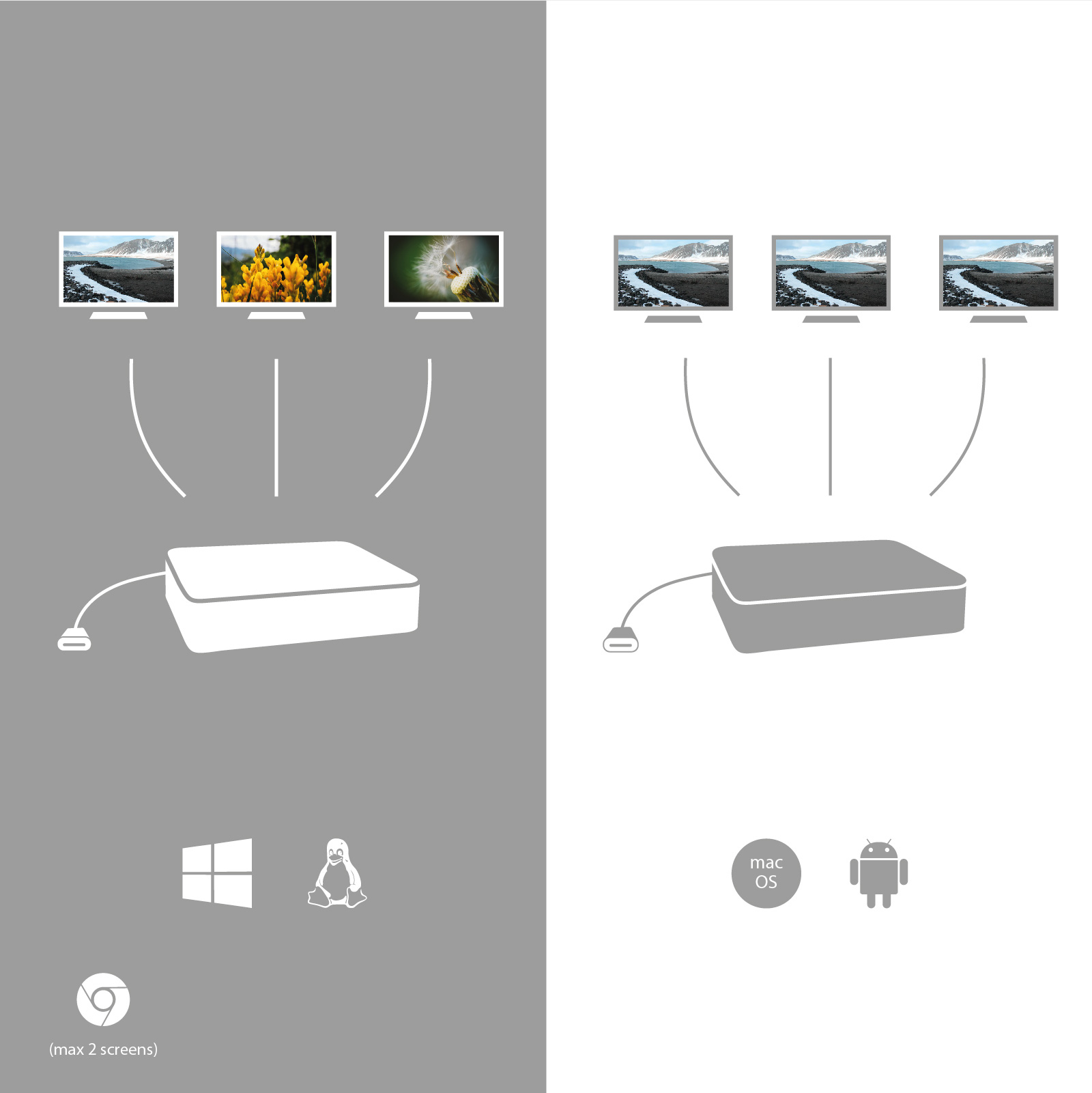 Opmerking: Het besturingssysteem macOS ondersteunt niet de technologie Multi Stream Transport (MST), wat betekent, dat er bij aansluiting op macOS hetzelfde beeld weergegeven wordt op alle aangesloten monitoren.