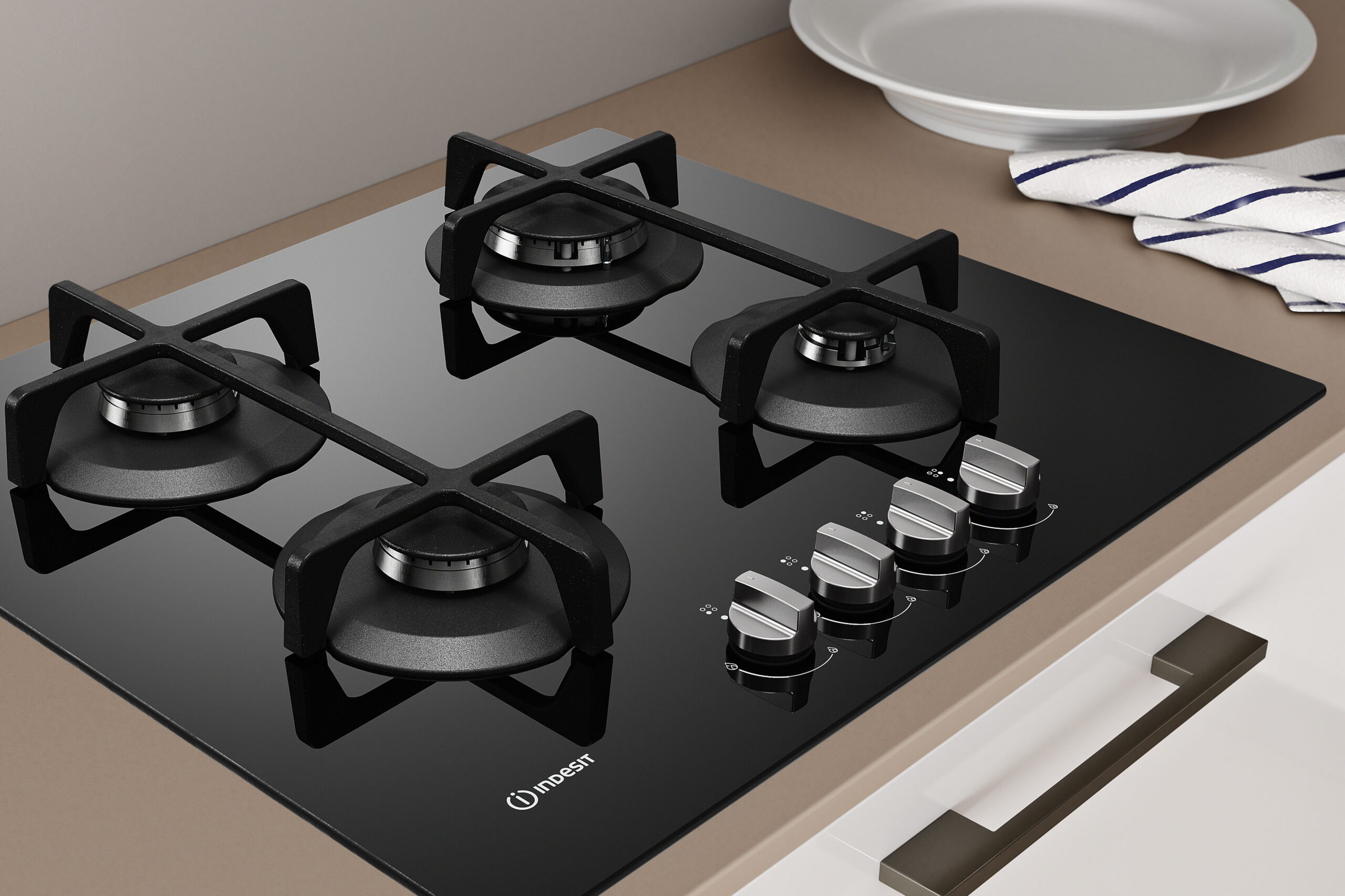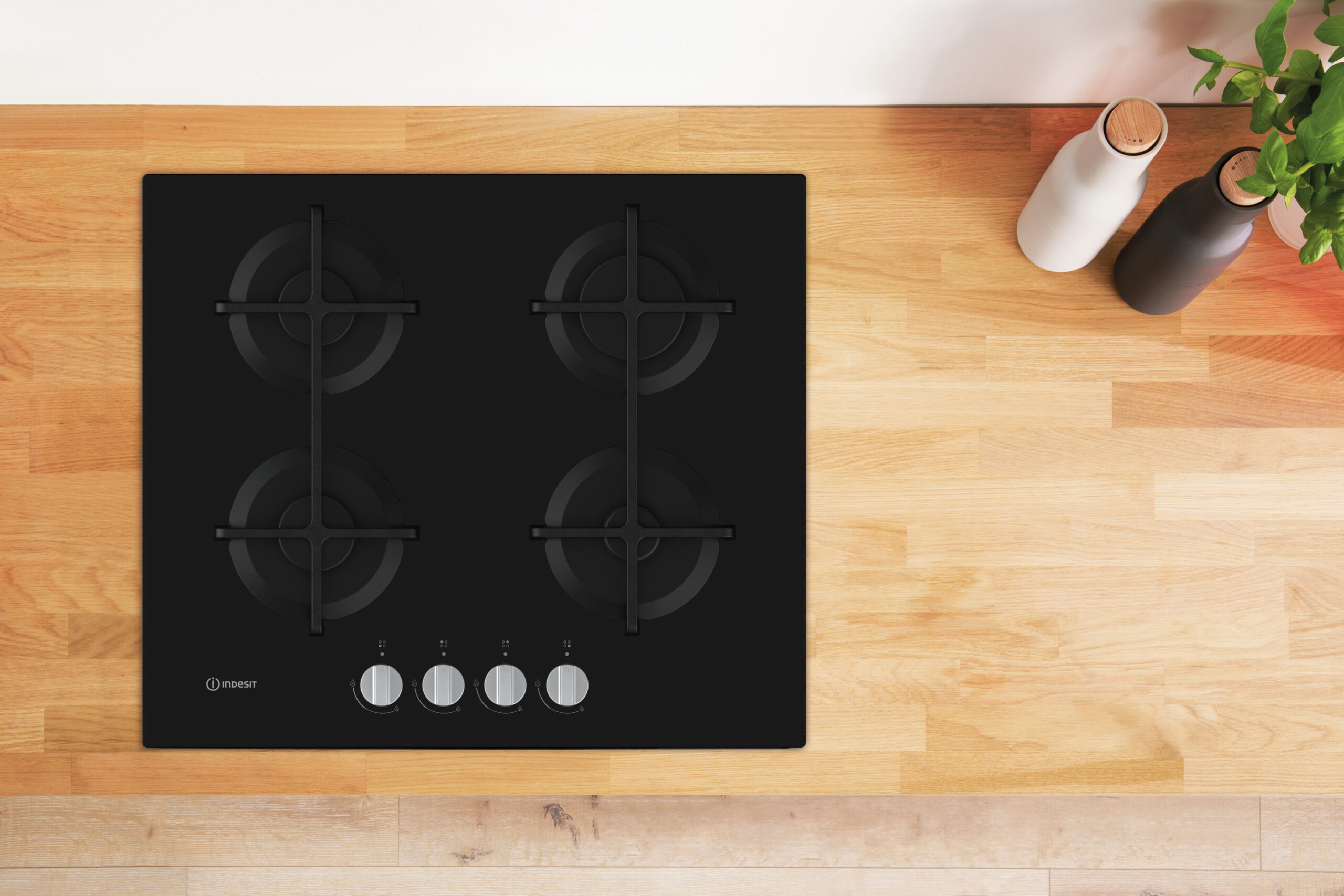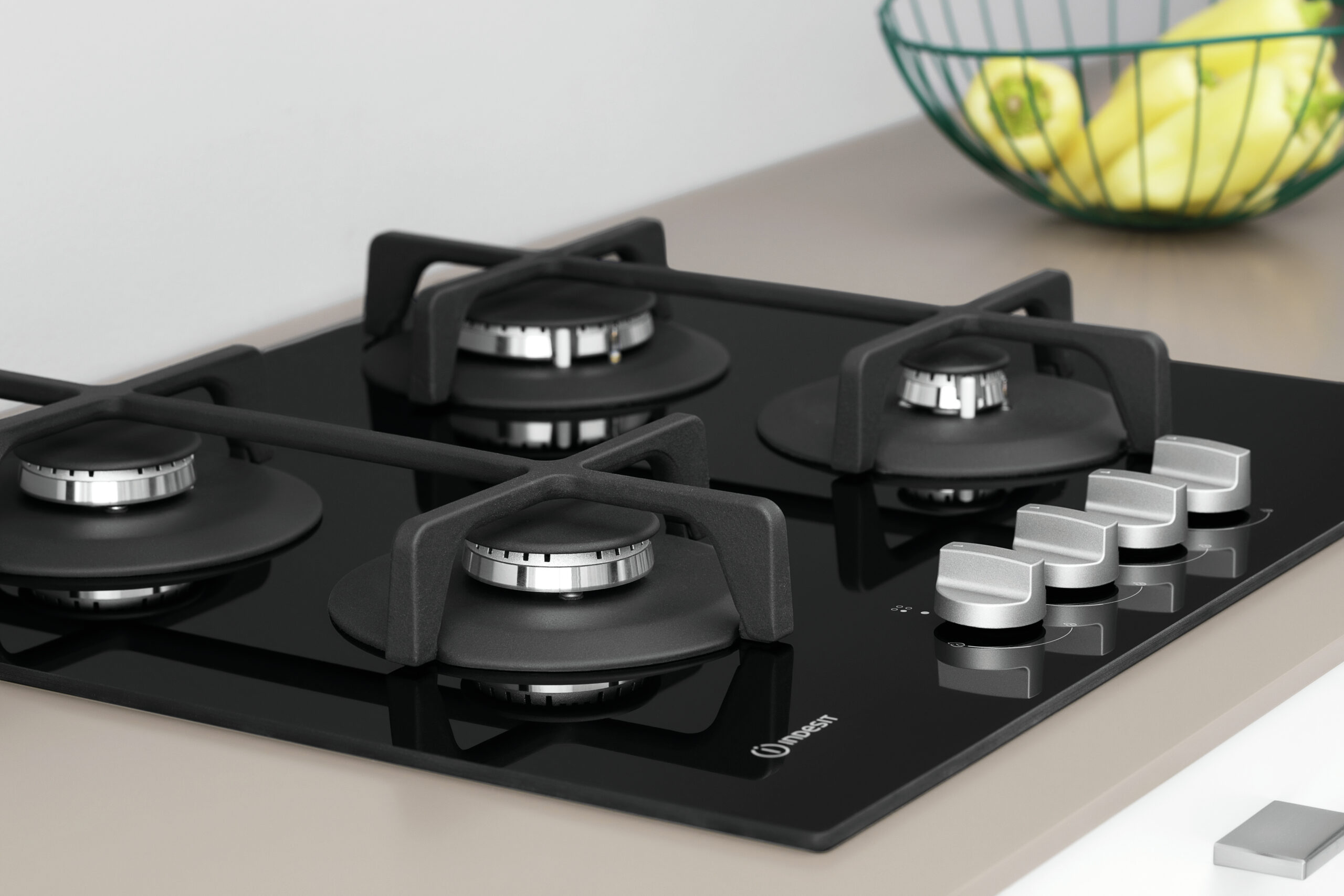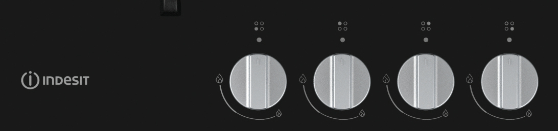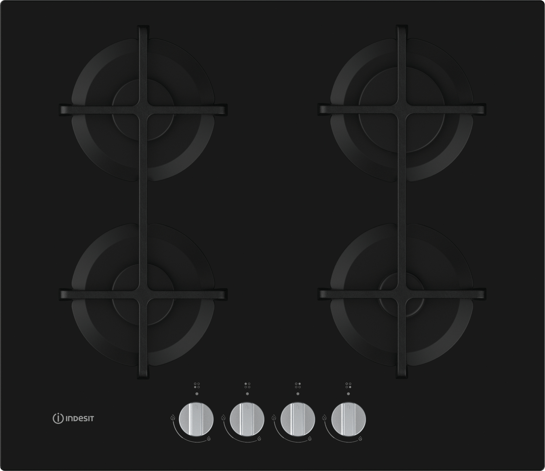 Indesit ING 61T/BK, Zwart, Ingebouwd, 59 cm, Gaskookplaat, Glas, 4 zone(s)