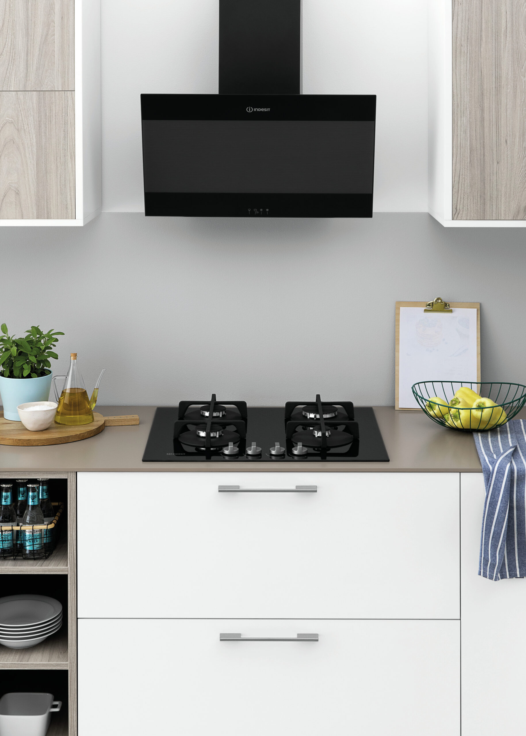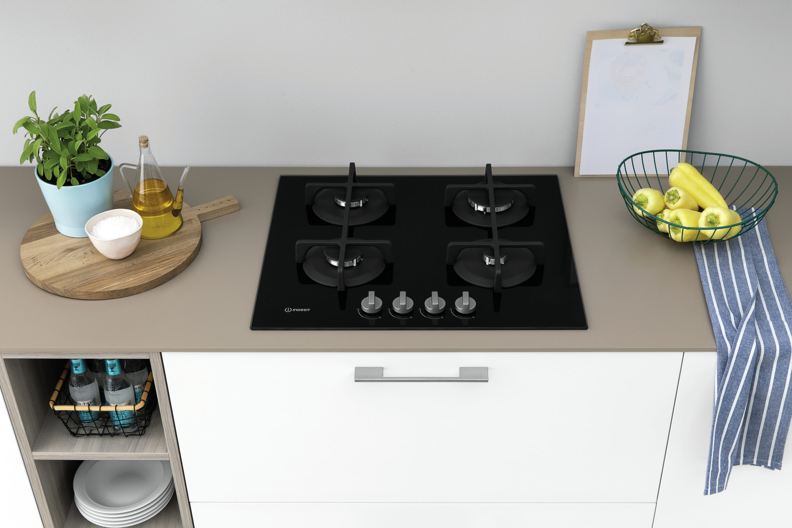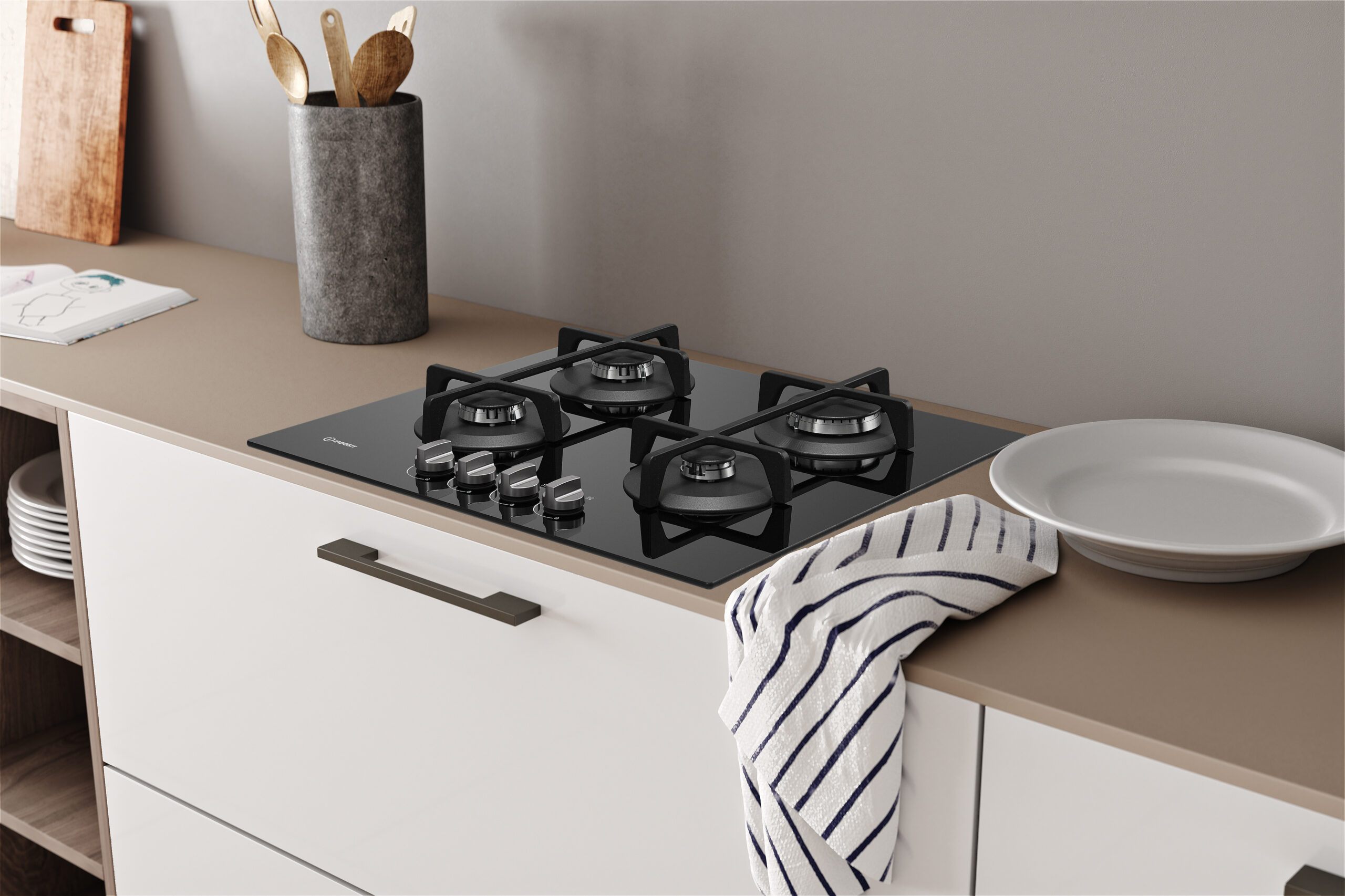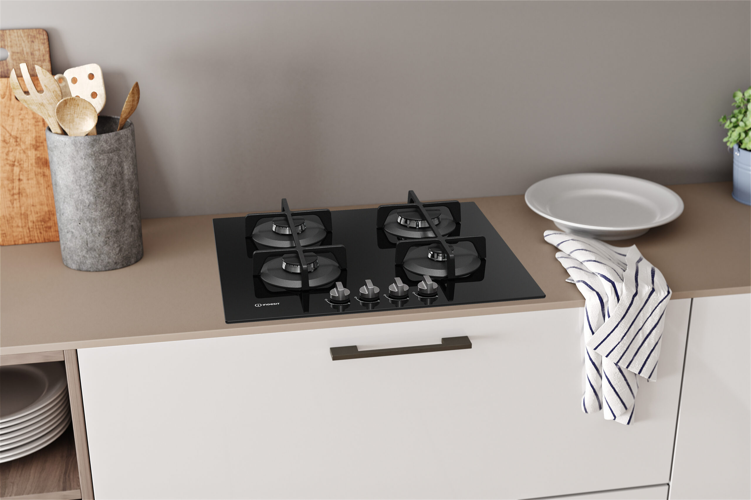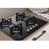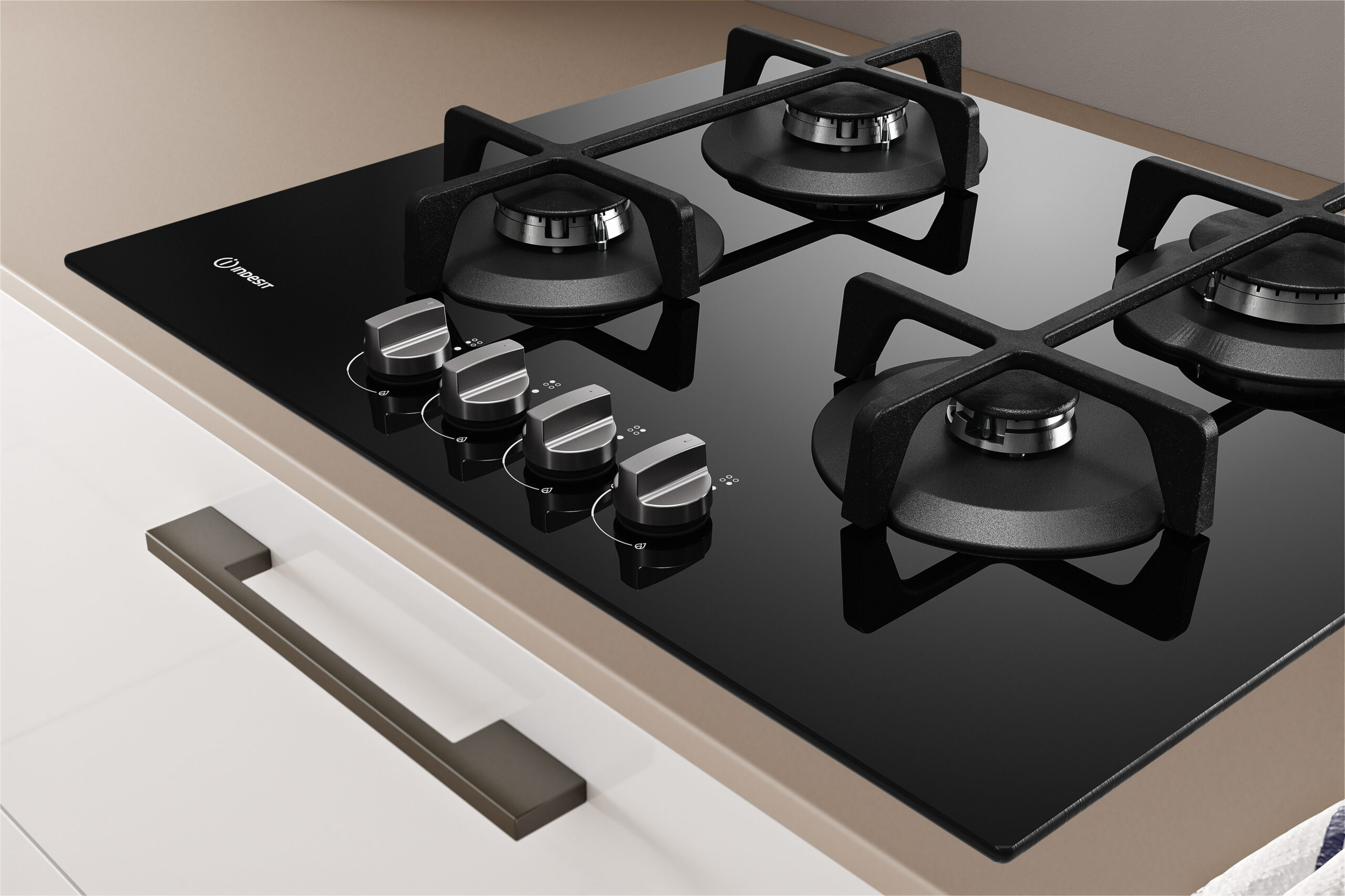 Indesit ING 61T/BK, Zwart, Ingebouwd, 59 cm, Gaskookplaat, Glas, 4 zone(s)