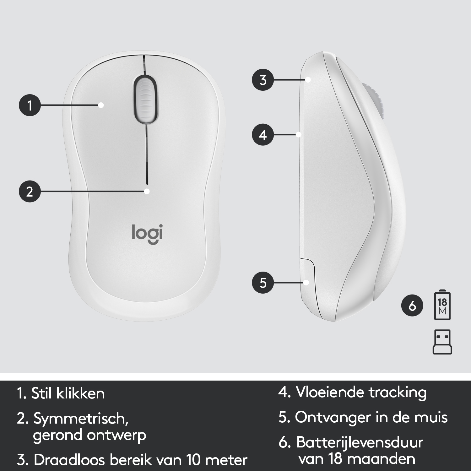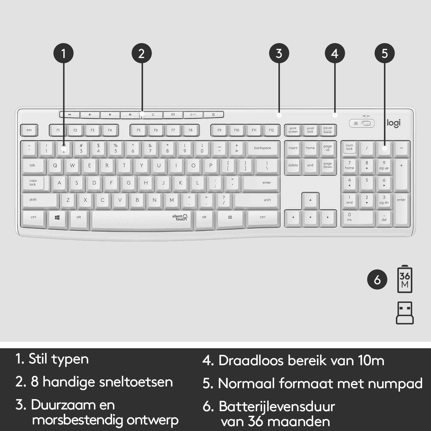 Logitech MK295 Silent Wireless Keyboard and Mouse CombonBlijf geconcentreerd en krijg meer gedaan met Logitech MK295 Silent Wireless Combo – een toetsenbord- en muiscombinatie die ontworpen is om rust te brengen voor jou en de mensen om je heen. Maak kennis met de nieuwe, vrijwel geluidloze toetsenbord- en muiscombinatie en ervaar de stilte. De combinatie maakt gebruik van de SilentTouch-technologie om de storende geluiden met meer dan 90% te reduceren terwijl het vertrouwde typ- en klikgevoel behouden blijft. Een stabiele, betrouwbare draadloze 2.4 GHz-verbinding met een bereik van 10 m zorgt voor een vertragingsvrije verbinding en een overzichtelijk bureau. Het morsbestendige ontwerp, de duurzame toetsen en de stevige kantelpoten met aanpasbare hoogte maken de apparatuur nog handiger en comfortabeler.nnSilentTouch-technologienInnovatieve SilentTouch-technologie geeft hetzelfde typ- en klikgevoel, maar 90% minder geluid.n90% minder geluid in vergelijking met de Logitech MK270. Geluidsniveau van klikken met linkermuisknop en typen gemeten in onafhankelijke labtest op 1 m.nnComfortabel toetsenbord van normaal formaatnToetsenbord met acht handige sneltoetsen en numpad van normaal formaat voor efficiënte invoer van gegevens en eenvoudige navigatie.nnComfortabele en compacte muisnGevormde en draagbare vorm met soepel, nauwkeurig klikken en aanwijzen op bijna alle oppervlakken.nnBetrouwbaar en draadloosn Stabiele, betrouwbare en vertragingsvrije draadloze 2.4 GHz-verbinding met een bereik van 10 m en een kleine USB-ontvanger voor een opgeruimd bureau.nnEenvoud van plug-and-playnCompatibel met Windows of ChromeOS en gemakkelijk te verbinden voor de eenvoud van plug-and-play.nnKwaliteit en duurzaamheidnMorsbestendig ontwerp, duurzame toetsen en stevige kantelpoten met aanpasbare hoogte.nGetest onder beperkte omstandigheden (maximaal 60 ml vloeistof gemorst). Dompel toetsenbord niet onder in vloeistof.nnDuurzame batterijnDankzij een batterijlevensduur van 36 maanden voor het toetsenbord en 18 maanden voor de muis en aan-uitschakelaars kun je maandenlang vooruit zonder je zorgen te maken over de batterijen.nnAcht sneltoetsennZo heb je direct toegang tot afspelen/pauzeren, volume regelen, dempen en zelfs je e-mails.