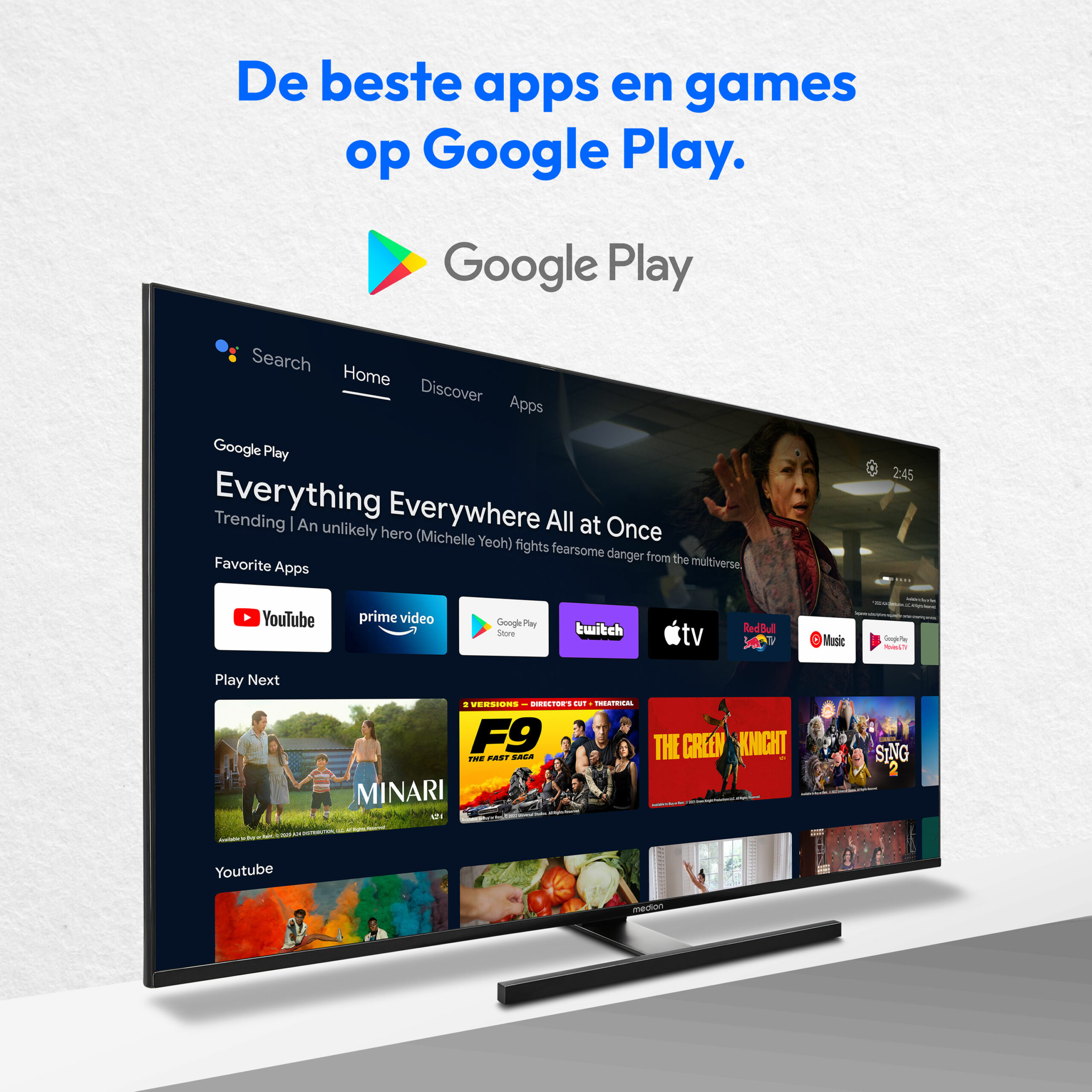 Krijg toegang tot meer dan 400.000 films en shows, speel muziek en games, zet inhoud van elk apparaat over naar je tv en voeg de apps toe die je het meest gebruikt – allemaal met Android TV. Je kunt ook je stem gebruiken om programma’s te zoeken, je tv te bedienen, je dag te plannen en nog veel meer. Vraag maar aan Google.