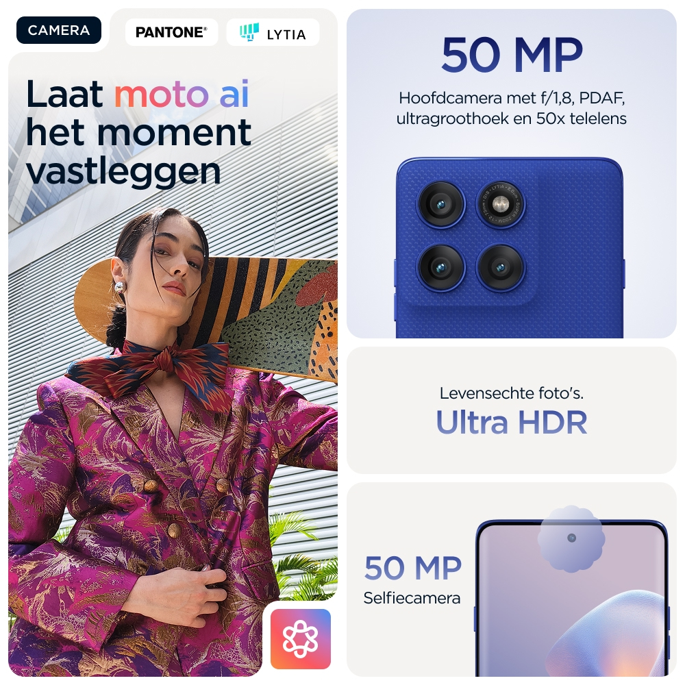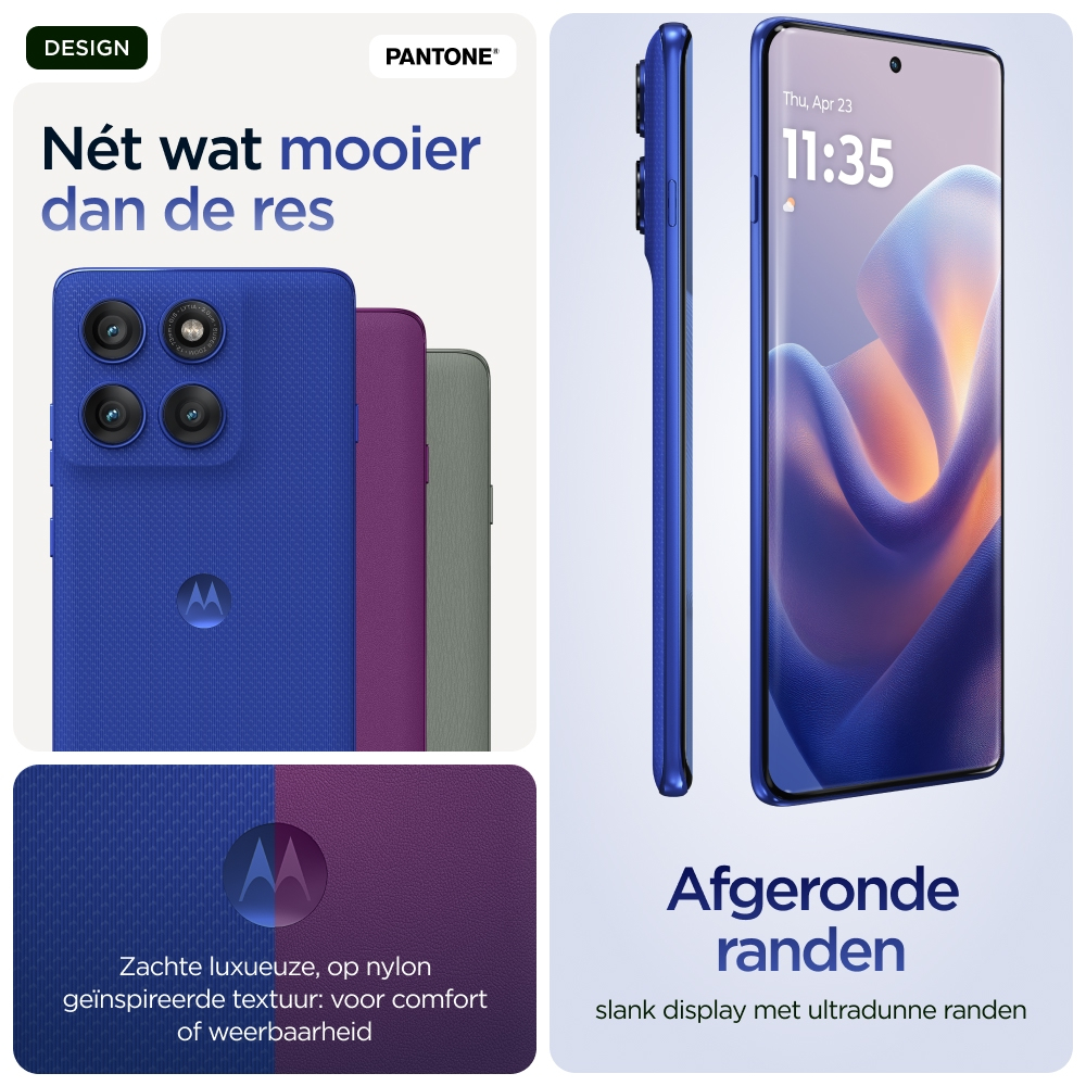 Je verwacht het beste als het gaat om vakmanschap. Maak kennis met de motorola edge 60 pro. Met zijn prachtige design met vier gebogen randen, zachte afwerkingen en door Pantone® geselecteerde kleuren biedt dit toestel het ultieme in stijl en comfort. Maak moeiteloos professionele foto’s en video’s door eenvoudig de camera te richten en te klikken. Ervaar hoe moto ai je creativiteit stimuleert en je achter de schermen helpt met alledaagse taken. Reken op een uitzonderlijk stevige behuizing met zorgeloze bescherming onder water(1) en een design dat voldoet aan militaire normen.(2) Ga non-stop op verkenning dankzij een accuduur van maximaal 45 uur.(4) Ga helemaal op in entertainment op een 6,7-inch Super HD-display (1220p), aangevuld met Dolby Atmos®-geluid. En profiteer van de kracht van met AI verbeterde prestaties binnenin. Geniet bovendien van moto-functies die creatieve vrijheid, moeiteloze interacties en je gemoedsrust bevorderen. Vind je eigen weg met de motorola edge 60 pro.