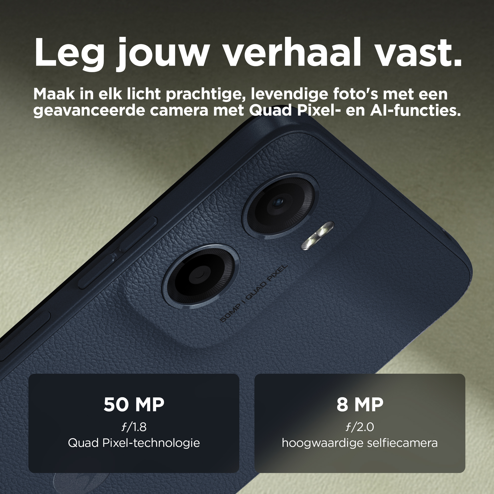 Scherpere foto’s. Schitterende verhalen.nErvaar adembenemend beeld en geluid met de nieuwe moto g05. Kijk je favoriete series en films op een superhelder display van 6,67 inch zelfs buiten in het zonlicht. En luister naar geluid overal om je heen dankzij krachtige stereoluidsprekers met Basversterking. Maak prachtig scherpe foto’s, dag en nacht, met het Quad Pixel-camerasysteem van 50 MP(2) met AI-powered portret. Verhoog je snelheid met superefficiënte prestaties en maximaal 12 GB RAM beschikbaar met RAM-boost(5). Met een afwerking van vegan leer, een waterafstotend design(4) en Corning® Gorilla® Glass 3 gaat de stijlvolle moto g05 lang mee. Vertrouw op een accu van 5200 mAh met een lange accuduur + TurboPower™ opladen. En krijg heel veel opslag voor je content en creaties. De moto g05 is in elk opzicht geweldig.