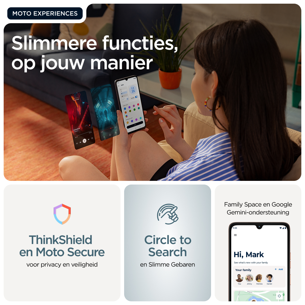 Alle mogelijkheden op zaknMaak kennis met de moto g06, een smartphone die je verwachtingen overtreft. Breng je favoriete series en films tot leven op een supergroot, helder 6,88-inch display, ons grootste display ooit op de moto g, met stereoluidsprekers en Dolby Atmos®-geluid. Maak schitterende foto’s bij elk licht met een 50MP-camerasysteem met AI-technologie.(1) Multitasking wordt superefficiënt met tot 12 GB RAM met RAM-boost.(2,5,6,10) Geniet zonder zorgen van een premium design met geavanceerde robuustheidsfuncties dankzij onder andere IP64-classificatie voor bescherming tegen water(3), Corning® Gorilla® Glass 3 en een veganistische leerfinish. Je smartphone gaat 2 dagen mee op één keer opladen.(4) En je krijgt exclusieve Moto-functies die je smartphone veiliger, persoonlijker en leuker maken. En met Circle to Search kun je alles wat je op je smartphone ziet direct opzoeken. Haal meer uit de moto g06.