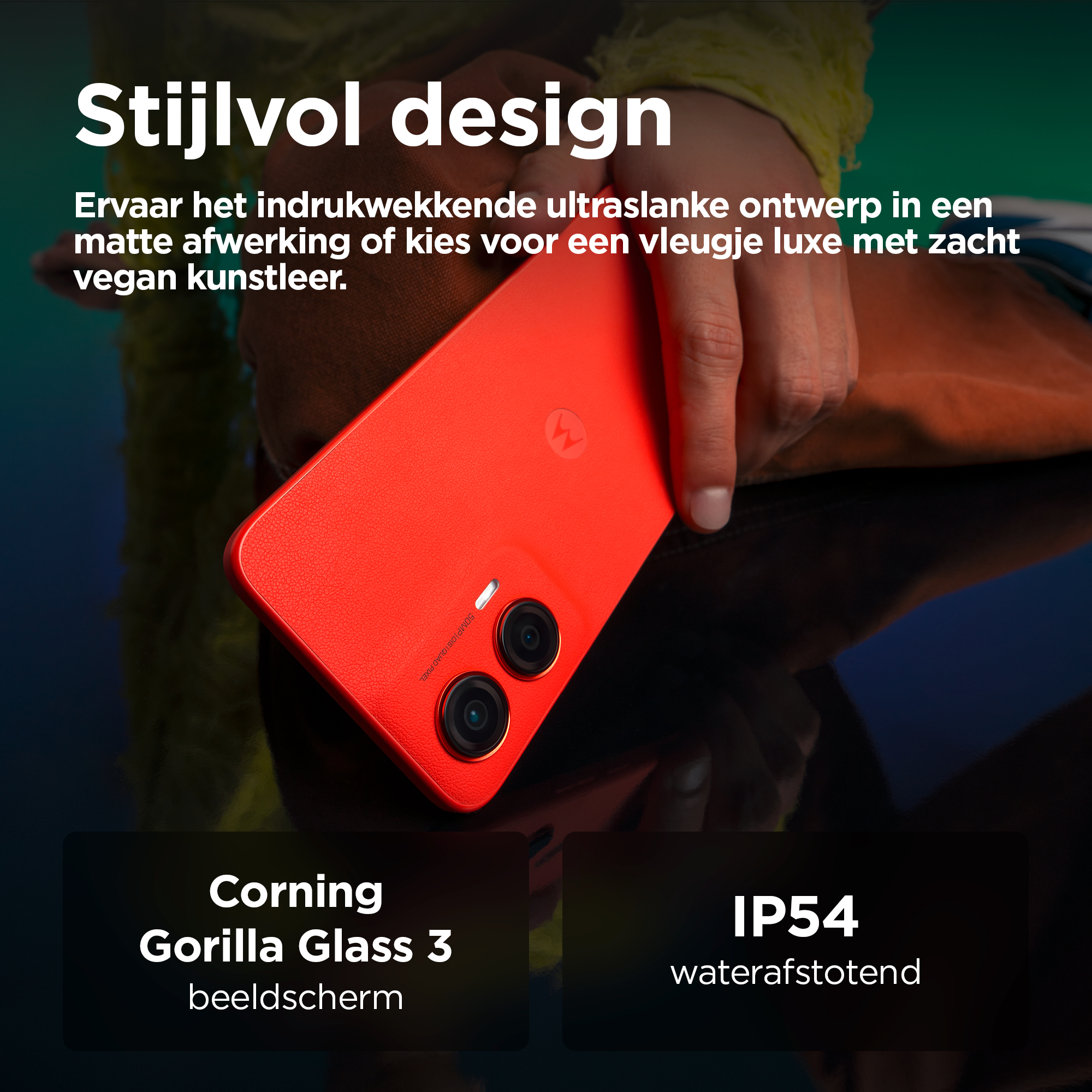 De grootste momenten in het leven verdienen een groot podium. Maak kennis met de moto g35 5G. Met een enorm FHD+-display van 6,72 inch komen je films, games en videogesprekken tot leven, zelfs in helder licht, met een piekhelderheid van 1000 nits. Dat alles wordt aangevuld met multidimensionaal Dolby Atmos®-geluid op stereoluidsprekers of je favoriete hoofdtelefoon. Maak adembenemende opnamen met de ultragroothoeklens of maak scherpe, heldere foto’s bij elk licht met de 50 MP-camera met Quad Pixel-technologie. Geniet van het prachtige, superdunne eersteklas design, inclusief een optie met het luxe gevoel van vegan leer. Profiteer van supersnelle 5G met een octa-core processor en krijg 8 GB RAM en maximaal 256 GB opslag.(2,4) Bovendien kun je altijd doorgaan doordat de accu lang meegaat. De moto g35 5G is gemaakt voor grote momenten.