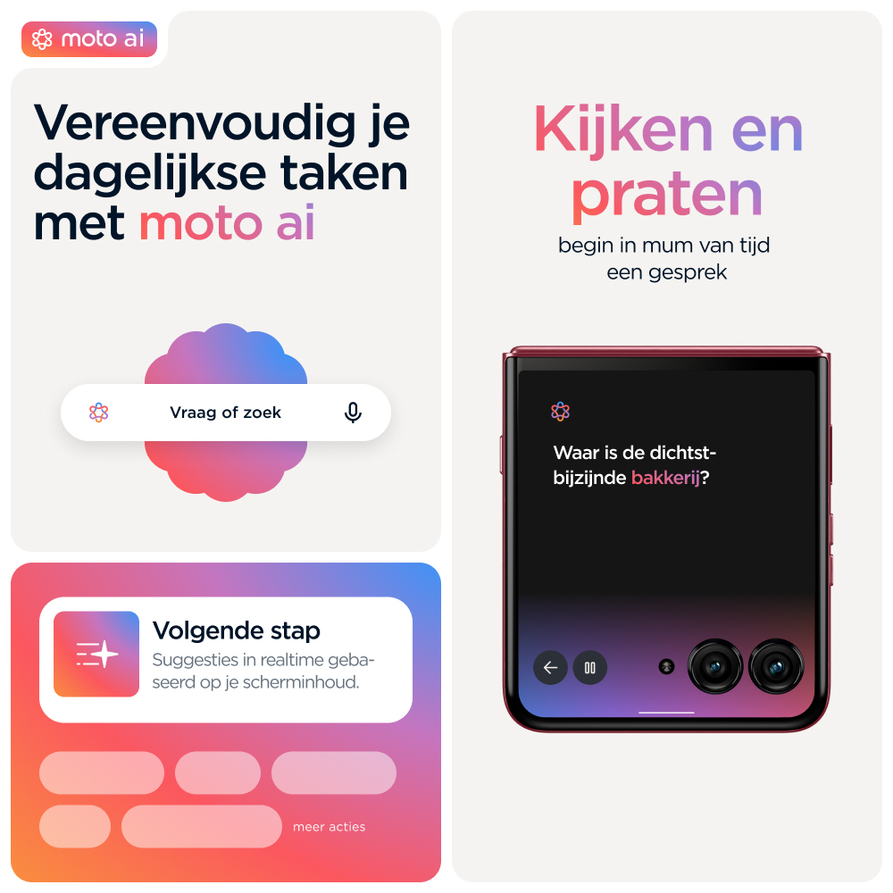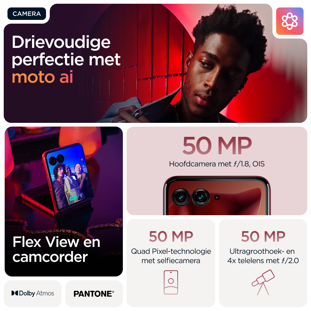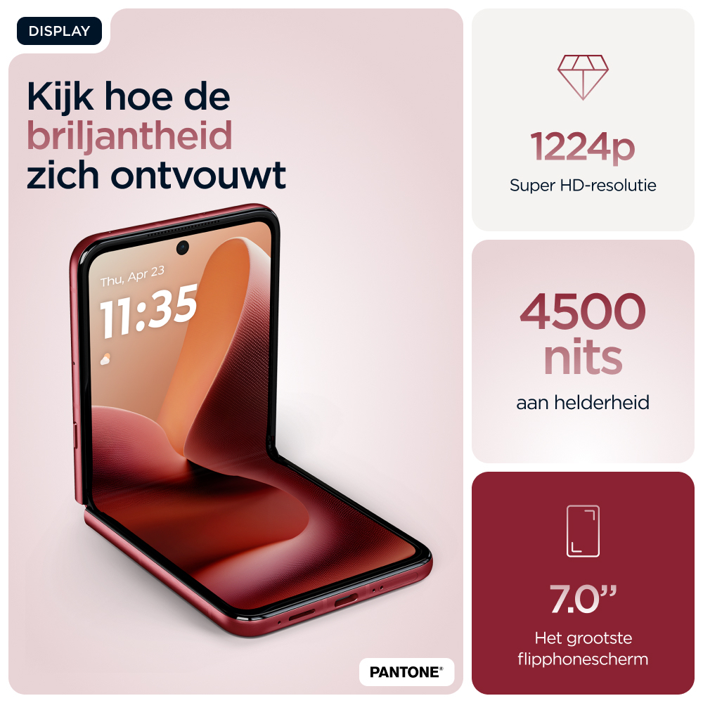 Kies voor slimmer. Kies voor sneller. Kies voor nog iconischer. Maak kennis met de motorola razr 60 ultra. Deze supercompacte en voortreffelijk vervaardigde flipphone is verkrijgbaar met opvallende afwerkingen zoals Alcantara(43) en echt hout, alle in speciaal geselecteerde Pantone-kleuren. Krijg eenvoudig toegang tot je favoriete apps op het meest intelligente en interactieve externe display. Dat alles zonder je smartphone open te klappen. Maak professionele foto’s en video’s en profiteer van persoonlijke hulp dankzij de naadloze integratie van moto ai(1). Alles gaat sneller met het toonaangevende Snapdragon® AI. En laad sneller op dan met elke andere flipphone(2) dankzij 68 W TurboPower™. De nieuwe motorola razr 60 ultra. Jouw toestel, jouw stijl.