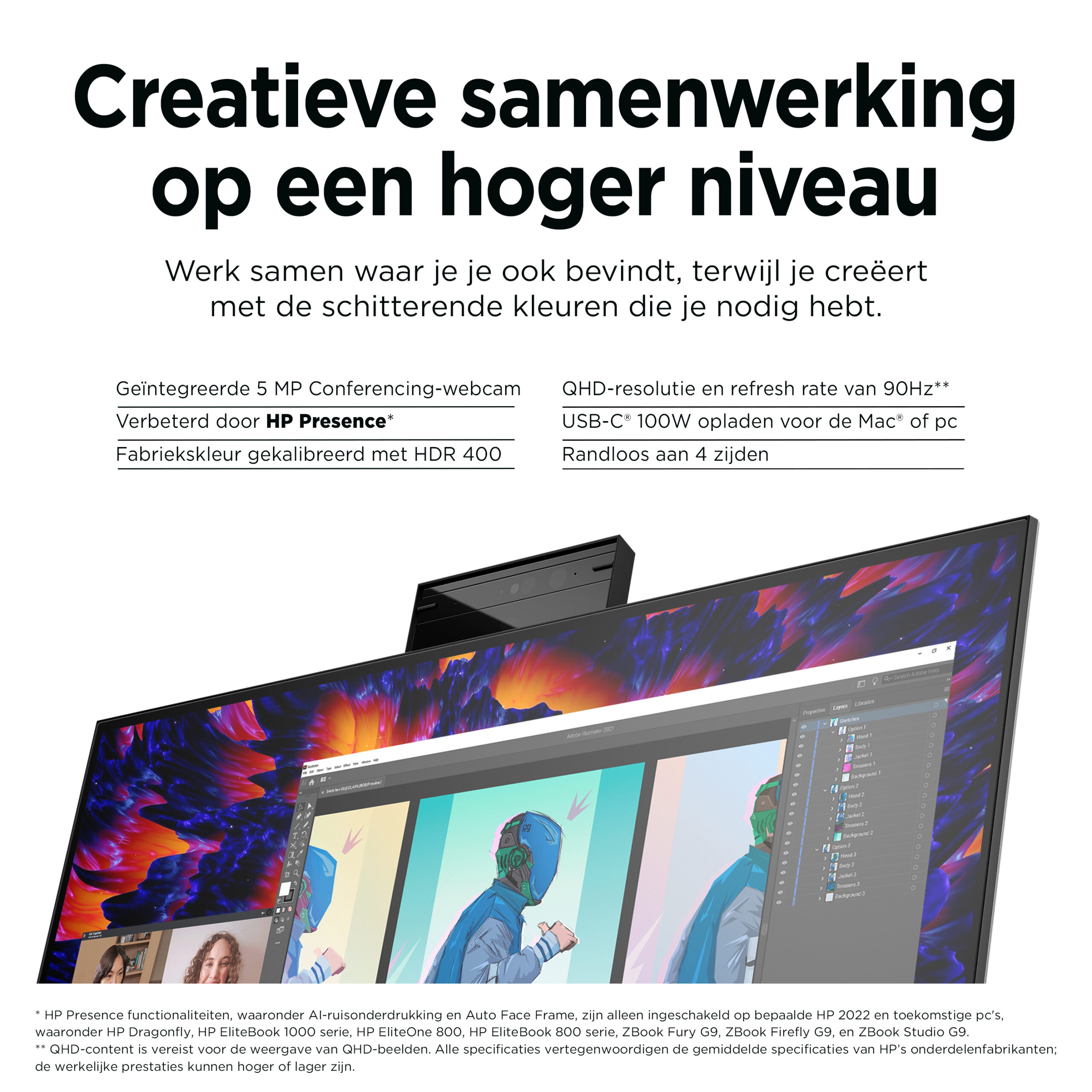 Met HP Presence[2] kun je samenwerken waar je ook bent, terwijl je creëert met de schitterende en levendige kleuren die je nodig hebt. Met de geïntegreerde conferencing 5 MP webcam, speakers en microfoon heb je het gevoel alsof je echt tegenover elkaar zit. Met het 60,5 cm (23,8 inch) HP Z24m G3 beeldscherm beschik je over kleurnauwkeurigheid, HDR en QHD om je ideeën tot leven te brengen.